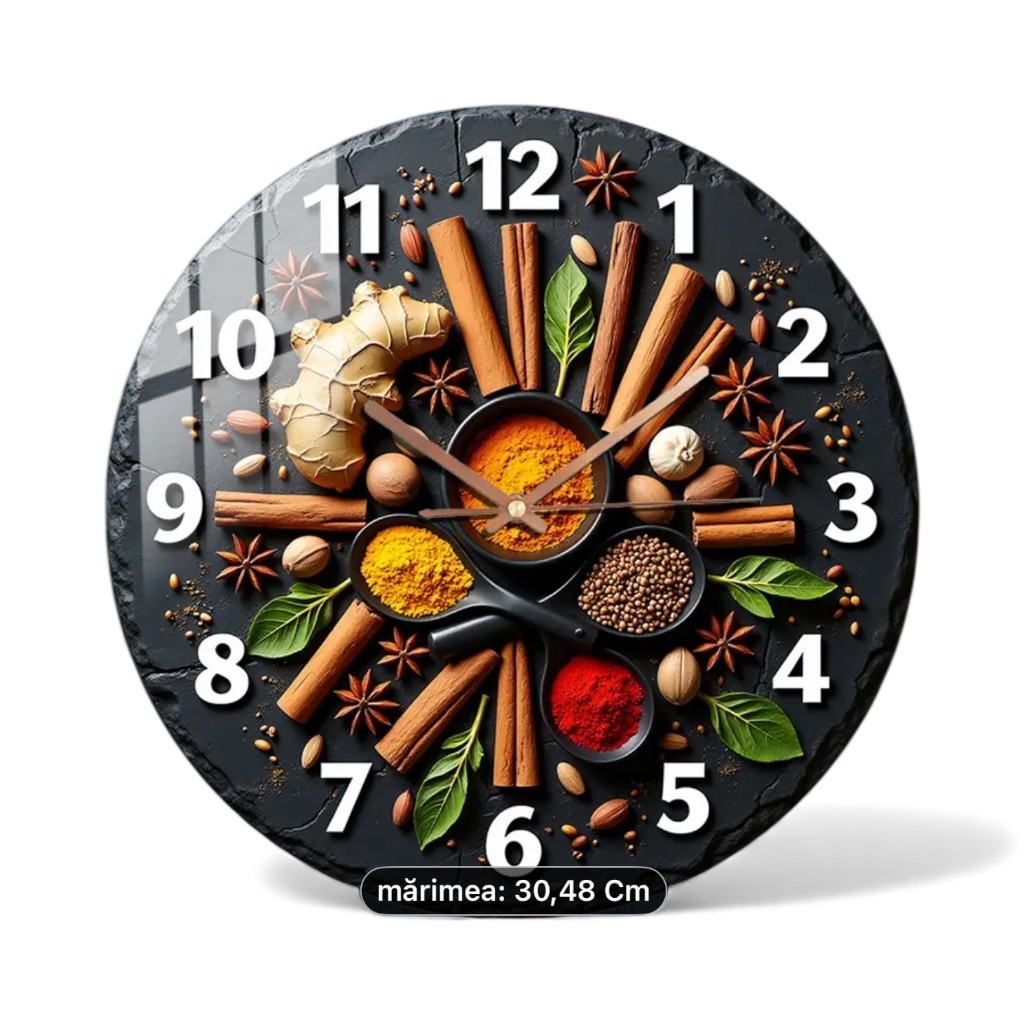 Cu un design vibrant ce reproduce realist condimente precum scorțișoară, turmeric, ghimbir, anason stelat și frunze aromatice, acest ceas devine instant un element central al oricărui spațiu culinar. Este ideal pentru bucătării, restaurante, cofetării, showroom-uri sau zone de servire.