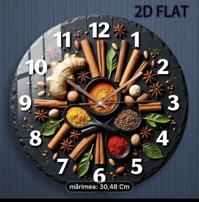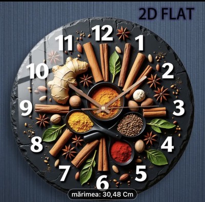 Adaugă personalitate și stil bucătăriei tale cu ceasul decorativ „Spice Art”, un model spectaculos în format 2D Flat, cu diametrul de 30,48 cm, inspirat din aromele și ingredientele care dau viață gastronomiei.