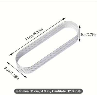 Realizează tarte perfecte, cu coacere uniformă și margini impecabile, folosind Setul de 6 inele perforate ovale din oțel inoxidabil, esențial în orice laborator de cofetărie sau bucătărie profesională.